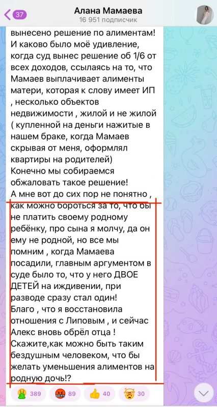 «Как можно быть таким бездушным человеком, чтобы желать уменьшения алиментов на родную дочь?! Как можно бороться за то, чтобы не платить своему ребенку?! Про сына я вообще молчу. Да, он ему не родной, но все мы помним, что когда Мамаева посадили, главным аргументом в суде было то, что у него ДВОЕ детей на иждивении. При разводе сразу стал один!», – возмутилась Алана в соцсетях.