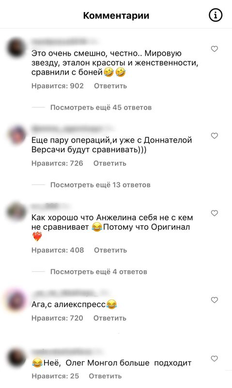 «Очень смешно! Мировую звезду, эталон красоты и женственности сравнили с Боней…», «Олег Монгол тебе больше подходит», «Еще пару операций и уже с Донателлой Версаче будут сравнивать», «Джоли с алиэкспресс, если только», «Самой собой не пробовала быть?! Зачем кого-то копировать?», «Как не старайся, все равно на Джоли не будешь похожа», - тверди интернет-пользователи.