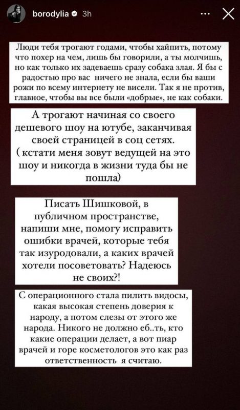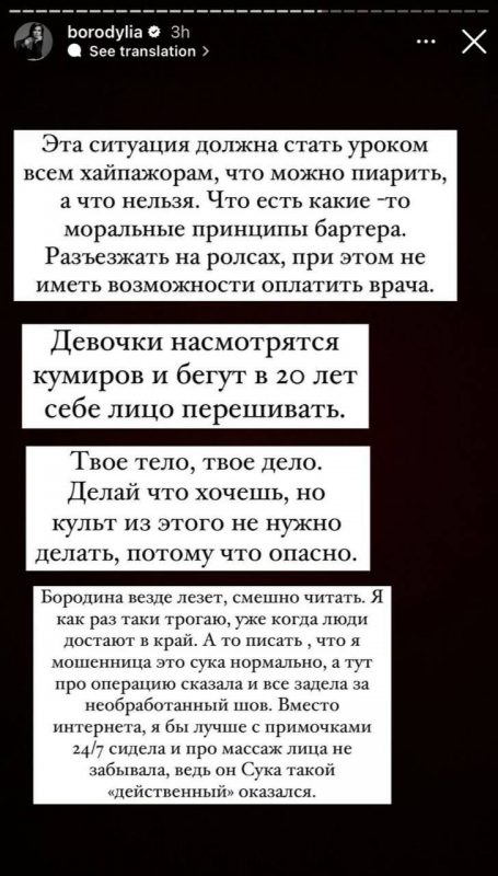 «Эта ситуация должна стать уроком всем хайпожорам, что можно пиарить, а что нельзя. Что есть какие-то моральные принципы бартера. Разъезжать на «Роллсах», но при это не иметь возможности оплатить врача. Девочки насмотрятся кумиров и бегут в 20 лет себе лицо перешивать. Твое тело - твое дело. Делай, что хочешь, но не нужно из этого делать культ».