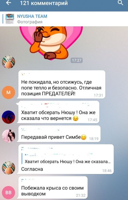 «Да у нас никто не покидает Россию. Все только временные подлецы», «Не покидала, но отсижусь где тепло и безопасно. Отличная позиция предателей», «Скатертью дорога, надеюсь, в нашем правительстве внесут законопроект лишать гражданства всех таких приспособленцев», – написали Нюше в Телеграме разгневанные читатели.