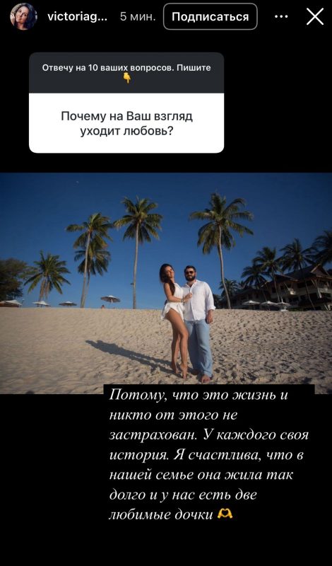 «Мы действительно с Мишей остались в хороших отношениях. Большая редкость, но это про нас. Никто никого не предавал и не бросал — это совместное решение. Он хороший, порядочный и добрый мужчина. Ему сейчас самому непросто, поверьте. Мне неприятно, что его выставляют в дурном свете на фоне дурацких слухов об уходе к другой. Это не так! Миша также остается прекрасным отцом для наших дочек. Между нами нет обид, недосказанностей, финансовых вопросов», — заверила Виктория.