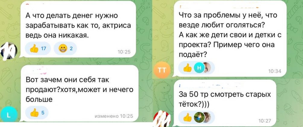 «А что делать, деньги надо зарабатывать как-то – актриса ведь она никакая», «Вот зачем они себя так продают? Хотя, может, и нечего больше», «За 50 тысяч рублей смотреть на старых теток?», «Что за проблемы у нее, что везде любит оголяться? А как же дети свои и детки с проекта (имеется ввиду «Голос. Дети» - прим.ред.)? Пример чего она подает?», - возмутились подписчики Telegram-канала «НЕБОЖЕНА».