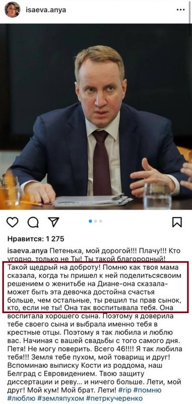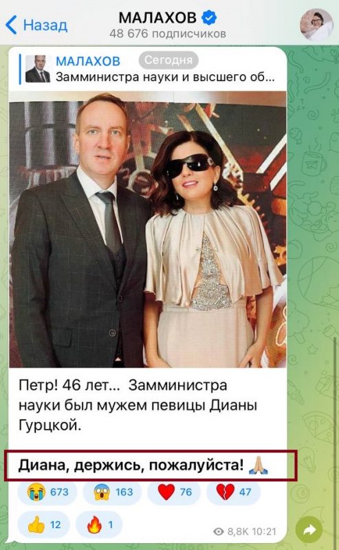 «Петр! 46 лет… Замминистра науки был мужем певицы Дианы Гурцкой. Диана, держись, пожалуйста!», - написал в своем Telegram-канале журналист.