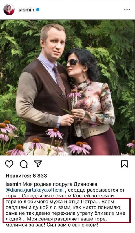«Моя родная подруга, Дианочка, сердце разрывается от горя… Сегодня вы с сыном Костей потеряли горячо любимого мужа и отца Петра. Всем сердцем и душой я с вами», - отметила исполнительница.