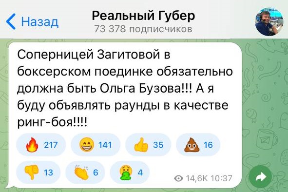 «Соперницей Загитовой в боксерском поединке обязательно должна быть Ольга Бузова!!! А я буду объявлять раунды в качестве ринг-боя!!!», - написал в своем Telegram-канале «Реальный Губер» Дмитрий.
