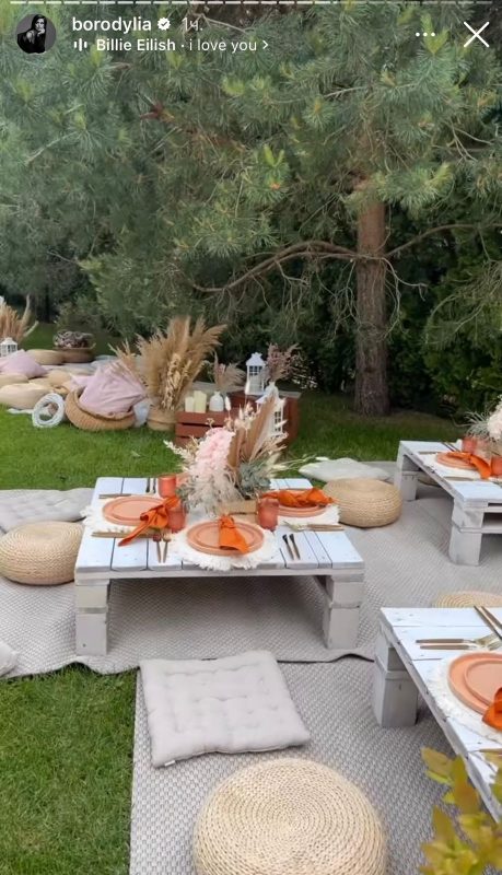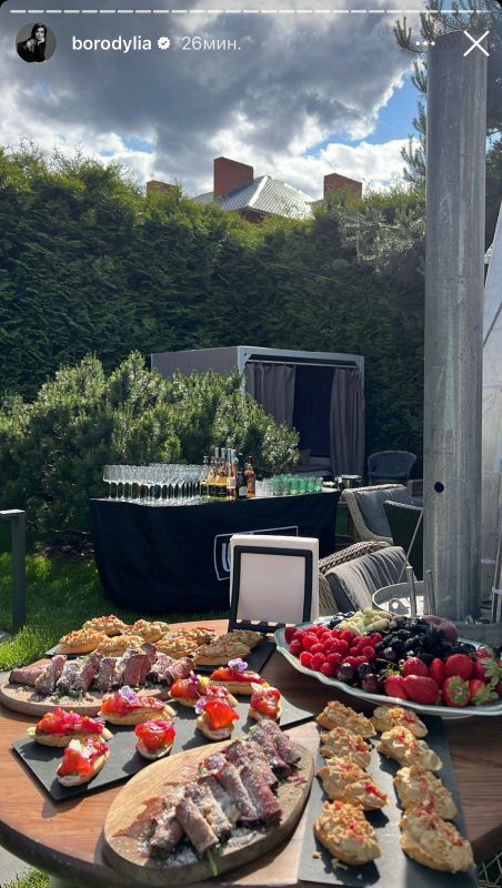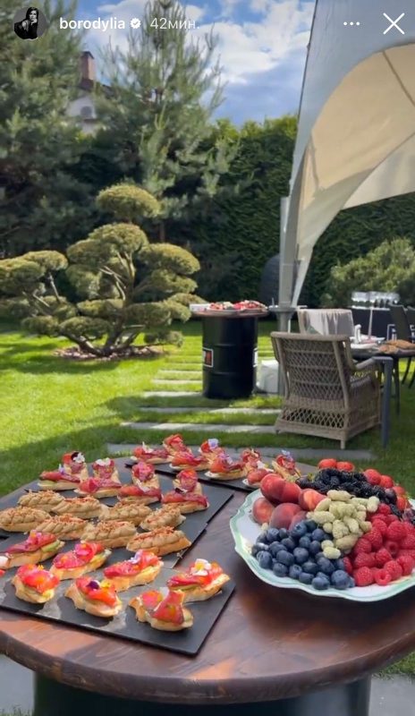 Во дворе своего загородного коттеджа Бородина устроила масштабное застолье. Для детей удобное ложе прямо на траве, а для взрослых огромный стол, на котором ломятся различные деликатесы - от фруктов и брускетт до изысканных блюд.