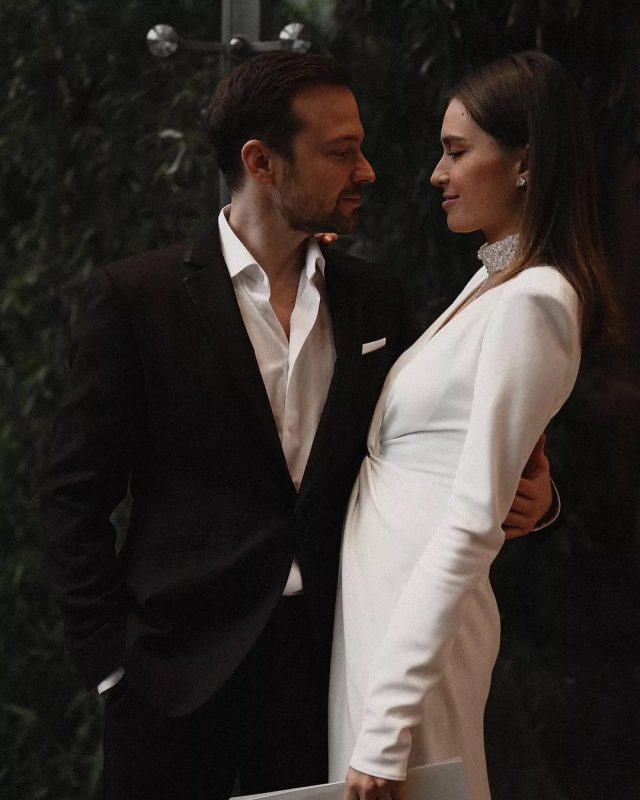 Стоит отметить, что у Алексея лаконичное кольцо из желтого золота, а у его избранницы два кольца: помолвочное с розовым бриллиантом и обручальное из белого золота с россыпью драгоценных камней.