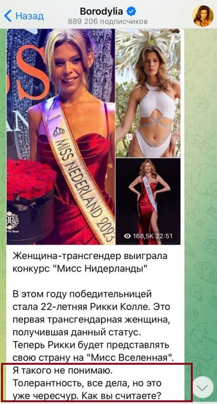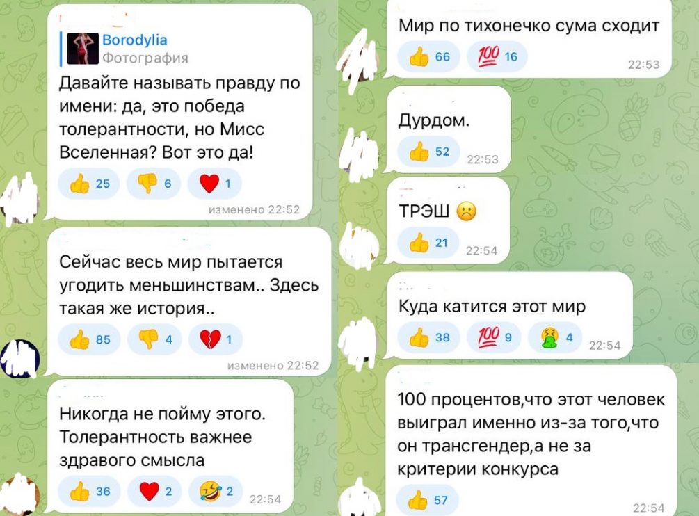 «Давайте называть правду по имени: да, это победа толерантности, но «Мисс Вселенная»? – Вот это да!», «Сейчас весь мир пытается угодить меньшинствам… Здесь такая же история…», «Мир потихонечку с ума сходит», «Никогда не пойму этого. Толерантность важнее здравого смысла», «100 процентов этот человек выиграл именно из-за того, что он – трансгендер, а не по критериям конкурса», - написали они.