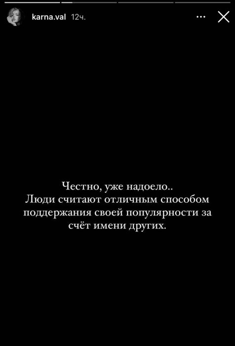 Пользователи расценили поддержку рэпера в адрес Вали знаком примирения и уже начали надеяться на их воссоединение. Однако блогерша опубликовала неоднозначную сторис, где намекнула на то, что Крид снова пиарится на её имени.