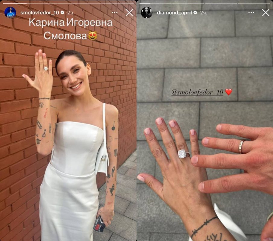 «Карина Игоревна Смолова», - подписал кадр, на котором брюнетка хвастается кольцом с внушительным бриллиантом, Смолов.