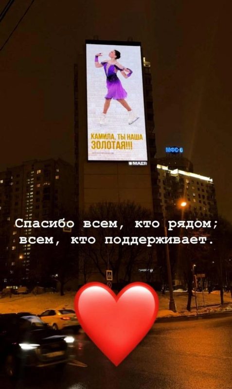 Развернутого комментария, которого так ждали фанаты, Камила не дала, зато поблагодарила всех, кто ее поддерживает. Она сопроводила свое послание трогательным снимком, где на экране многоэтажки разместили баннер с её изображением и подписали: «Камила, ты наша золотая!!». Фигуристка продублировала снимок в личном блоге и написала: «Спасибо всем, кто рядом, кто поддерживает!».
