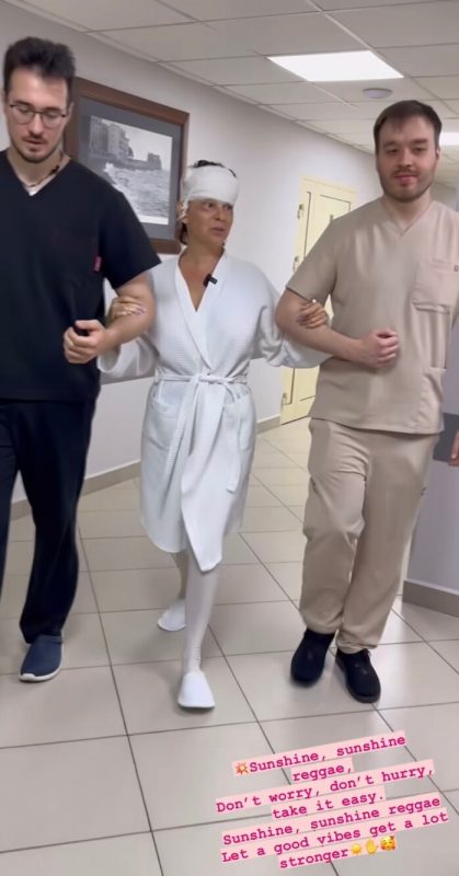 Пока певица морально не готова показывать свою фигуру, но выложила новое видео после операции. Штурм вышла из больничной палаты в белом халате и тапочки, компрессионных чулках и бинтах. Артистка едва ходит, поэтому под руки ее ведут два медбрата. Голова певицы забинтована, а под глазом видна гематома.