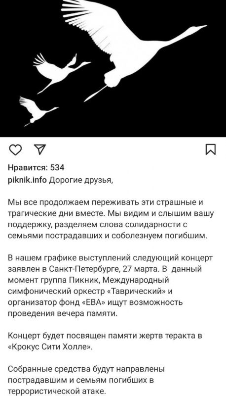 Музыканты объявили, что концерт в Санкт-Петербурге будет посвящен памяти жертв теракта в «Крокус Сити Холле». Сейчас группа вместе с симфоническим оркестром «Таврический» и организатором фонда «ЕВА» ищут возможность проведения вечера памяти.