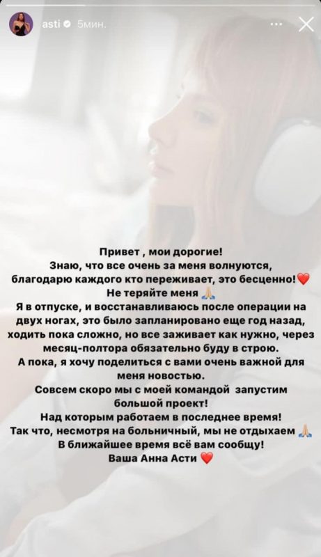 «Совсем скоро мы запустим большой проект, над которым работаем в последнее время. Так что, несмотря на больничный отпуск, мы все равно работаем! В ближайшее время все вам сообщу! Ваша Анна Асти», - заключила исполнительница хита «По барам».