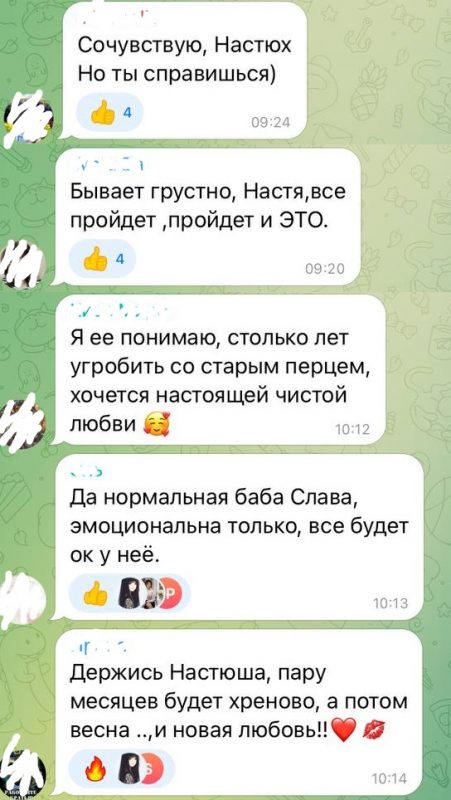 «Бывает грустно, Настя, все проходит, пройдет и это», «Сочувствую, Настюх, но ты справишься», «Я ее понимаю, столько лет угробить со старым перцем. Хочется настоящей чистой любви», «Да нормальная баба Слава, эмоциональная только, все будет ОК у нее», «Держись, Настюха, пару месяцев будет хреново, а потом весна и новая любовь», - поддержали артистку пользователи Сети.