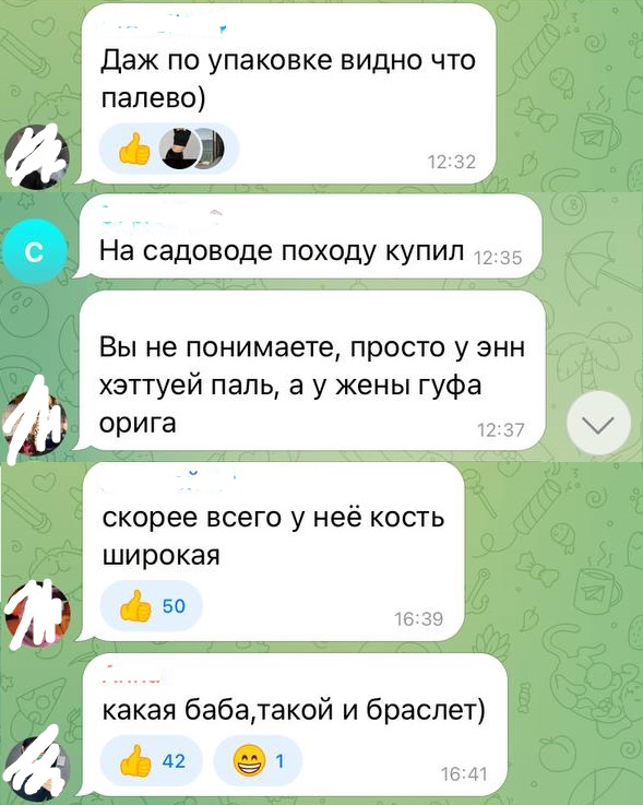 «Даже по упаковке видно, что палево», «На Садоводе, походу, купил», «Вы не понимаете, просто у Энн Хэтэуэй - паль, а у жены Гуфа – оригинал», «Скорее всего, у нее кость широкая», «Какая баба, такой и браслет», - смеются подписчики Telegram-канала «YOBAJUR».