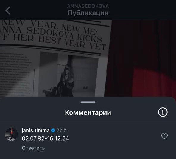 Напомним, что 16 декабря Седокова отмечала свое 42-летие. Несмотря на разрыв, Янис поздравил экс-возлюбленную с праздником и опубликовал их трогательное видео. После этого, как успели увидеть поклонники, баскетболист оставил под публикацией Анны свои дату рождения и дату смерти, а уже через несколько часов его бездыханное тело нашли на лестничной площадке хостела, в котором он остановился на днях. К слову, комментарий он успел удалить, и сейчас его уже нет. Но многочисленные пользователи твердят - это певица довела мужа до гроба, и просят проверить её по соответствующей статье.