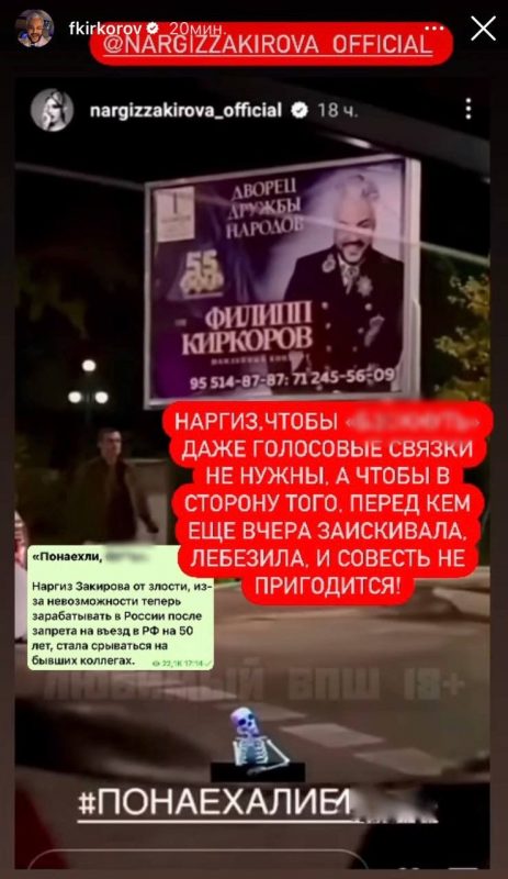 Изгнанная из страны на ближайшие 50 лет певица Наргиз Закирова высказала свое недовольство насчет грядущего концерта Филиппа Киркорова в Ташкенте. Будучи родом из Узбекистана, артистка с ненавистью продолжает высказываться о бывших поклонниках и коллегах из России. На этот раз она не сдержала эмоций и нецензурно выругалась, увидев афишу поп-короля на одной из улиц родного города.