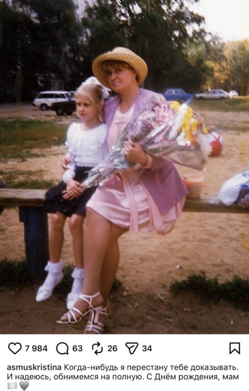 В соцсетях она опубликовала старую фотографию с 1 сентября возле школы в подмосковном Королеве. На фото маленькая Кристина стоит рядом с мамой Радой Викторовной. Кристина одета в нарядную блузку и юбкеу, а мама держит цветы и обнимает дочь за плечи. Под снимком Асмус оставила короткое обращение.