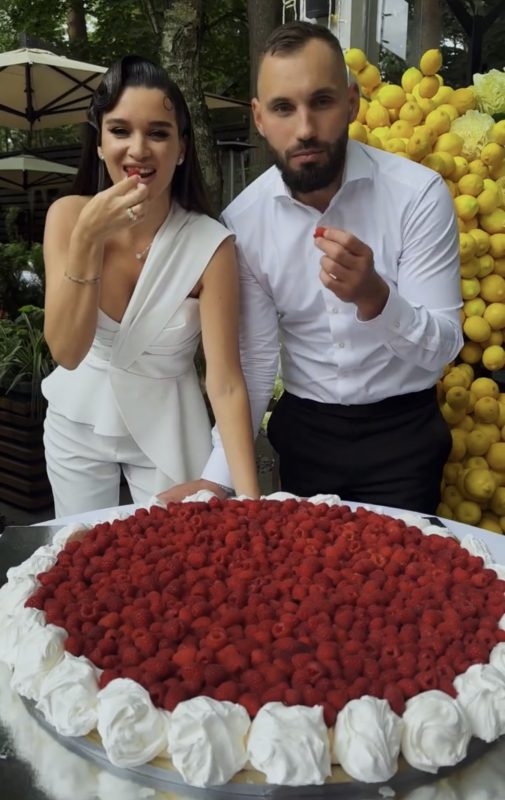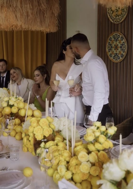 Пара вместе с гостями отметили роспись в узком кругу в ресторане: банкетный зал был щедро декорирован белыми и розовыми живыми цветами, а также лимонами и белыми свечами. Невеста за столом призналась, что даже её мама до последнего не знала, когда будет церемония бракосочетания дочери.