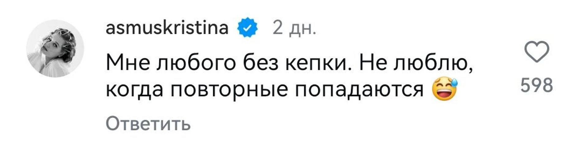 Эта публикация не прошла мимо Асмус, о чем она поспешила сообщить в комментариях. «Мне любого без кепки. Не люблю, когда повторные попадаются», - подколола Кристина бывшего мужа, стоящего единственным в головном уборе.