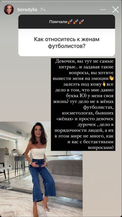 «Девочки, вы тут не самые хитрые. Я понимаю, что, задавая такие вопросы, вы хотите вывести меня на эмоции, залезть под кожу. Но все дело в том, что мне давно по фигу. У меня своя жизнь. Тут дело не в женах футболистах, косметологах, бывших «женах» и просто девочек-дурочек. Дело в порядочности людей, а их в этом мире немного, как и вас с бестактными вопросами», — отреагировала Бородина.