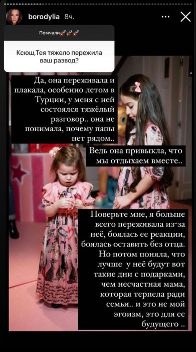«Я боялась реакции Теоны, боялась оставить без отца. Но потом поняла, что лучше у неё будут вот такие дни с подарками, чем несчастная мама, которая терпела ради семьи!», - добавила Бородина.