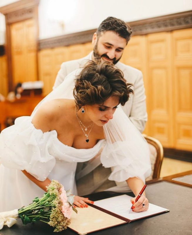 «Я стала супругой Сарика Андреасяна! Кто бы мог подумать! Ведь впервые я узнала о тебе в феврале 2017 года, когда вышел фильм «Защитники». Я помню, как зашла на твою страничку в Instagram* и даже не подписалась. Потом, в июне 2018, ты утвердил меня в свой фильм, и в июле 2018 мы познакомились», — поделилась воспоминаниями невеста.