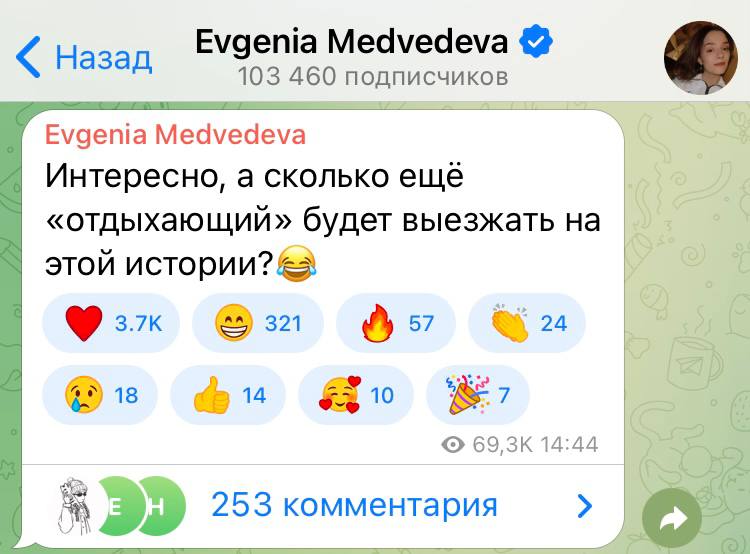 «Интересно, а сколько еще «отдыхающий» будет выезжать на этой истории?», - возмутилась Женя в своем Telegram-канале, сопроводив вопрос смеющимся смайлом.