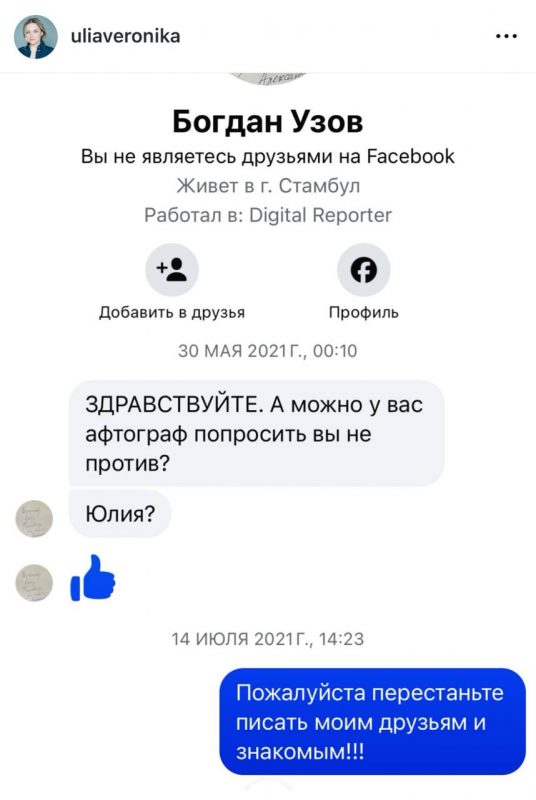 «С 2021-го года меня преследует психически нездоровый человек… Он звонит и пишет всем моим знакомым и друзьям, представляется то инвалидом, то поклонником, то сценаристом, то кем-нибудь еще… Был Богданом Узовым, потом Олегом Воронковым, потом Анной Кузьминой, а сейчас он сценарист по имени Вячеслав. Это один и тот же человек!» – заявила Юлия.