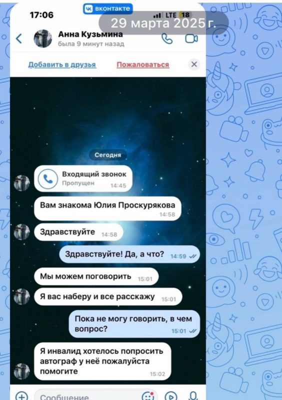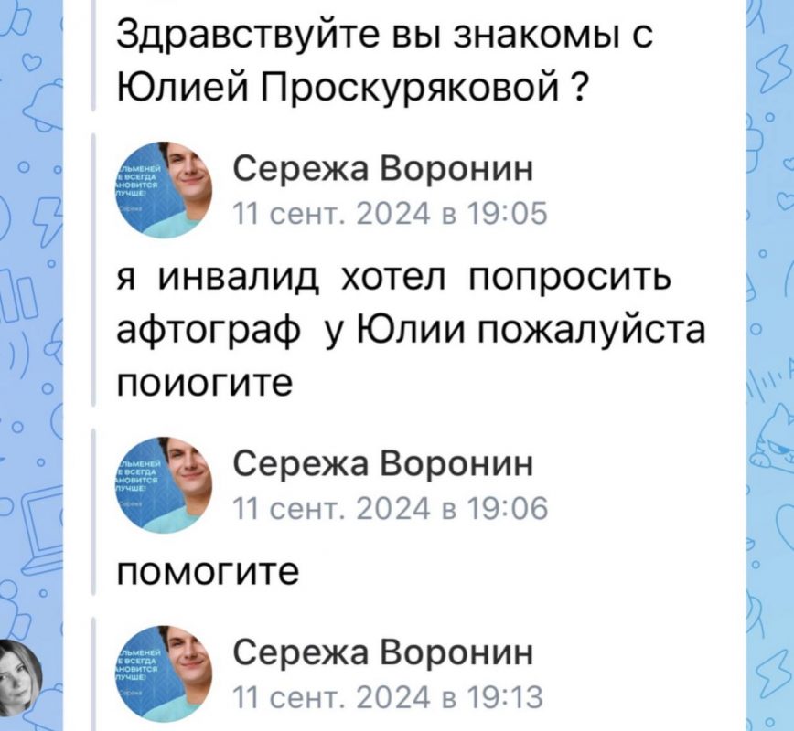 Проскурякова рассказала, что впервые столкнулась со странным фанатом ещё в 2021 году. С тех пор он не прекращает попыток добраться до неё через знакомых, представляясь разными именами и придумывая новые легенды.