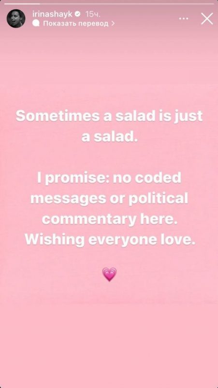 «Sometimes a salad is just a salad. I promise: no coded messages or political commentary here. Wishing everyone love (Иногда салат — это просто салат. Обещаю, что здесь нет никаких зашифрованных сообщений или политических комментариев. Желаю всем любви — пер. с англ.)», — написала в своих социальных сетях девушка.