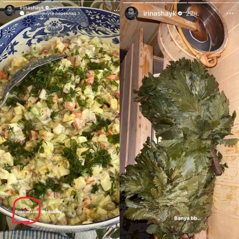 36-летняяя Ирина Шейк уже несколько лет живет за границей, однако не скрывает своей тоски по России. На днях в своем личном блоге супермодель опубликовала снимки, напоминающей ей о Родине — знаменитость выложила в своих сторис фотографии салата «Оливье» и парилки с банными вениками.