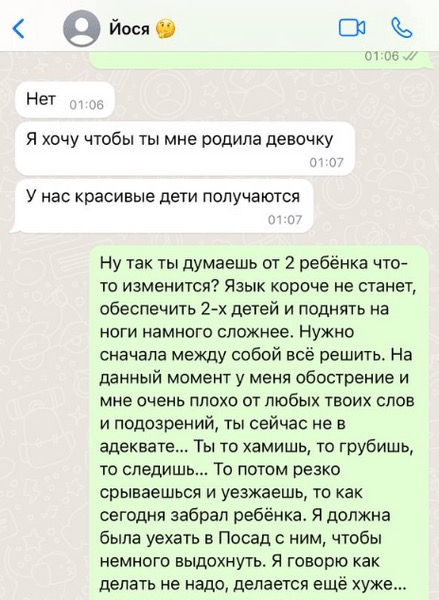 «На данный момент у меня обострение, мне очень плохо от любых твоих слов и подозрений! Ты сейчас не в адеквате. Ты то хамишь, то грубишь, то следишь. То потом резко срываешься и уезжаешь, то, как сегодня, забрал ребенка», - возмутилась Черно.