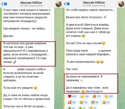 «Стоит пару слов сказать о мемах и «истерике», которую приписывают мне СМИ относительно закрытия популярной площадки. Где увидели только - не пойму. Друзья, официально с марафонами и даже, если хотите, с площадкой я морально попрощалась 1,5 года назад!», - прокомментировала блогер в своем Telegtam-канале.