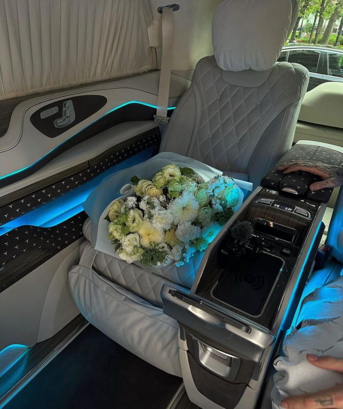 По признанию самой исполнительницы, машина обошлась в 30 миллионов рублей. Её вместительность составляет 5 пассажиров + водитель. Более того, она оснащена прозрачней крышей и «звёздным небом». Салон выполнен из натуральной кожи белого цвета, внутри которого есть даже беспроводная зарядка, мини-холодильник и многое другое.