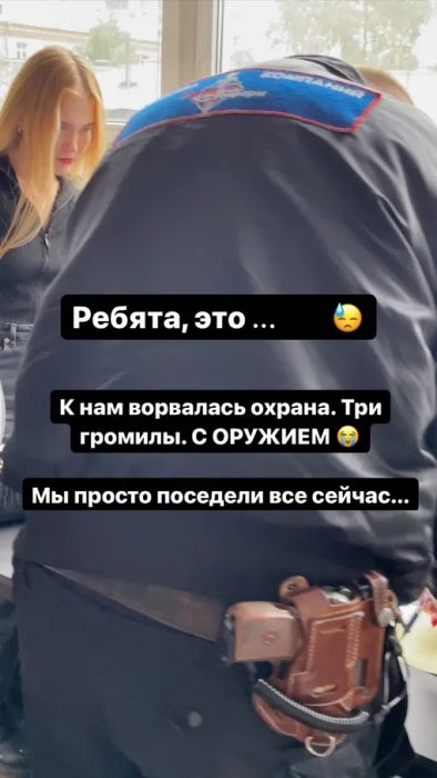 «Ребята, это... К нам ворвалась охрана. Три громилы с оружием. Мы просто поседели все! Аж душа в пятки ушла. Думаю, неужели мне подкинули что-то. И кому это нужно? Прямо испугалась!», — призналась артистка. Однако всё оказалось куда «эпичнее».