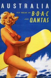 Одетая в красный винтажный купальник, Наоми держит в руках доску для серфинга, который является одним из любимых развлечений туристов, посещающих зеленый континент.