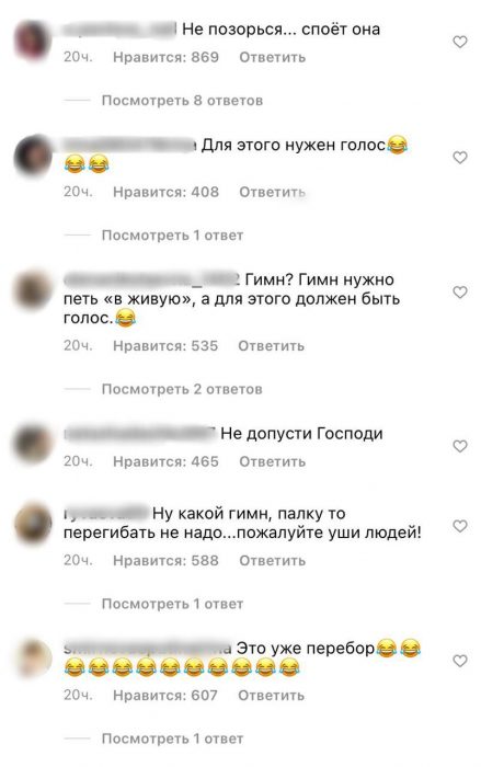 «Боже, храни Россию от исполнения таких мечт», «Только не это, не трогай, не смей», «Не позорь страну!», «Для этого нужен голос», «Побереги наши уши», «Только этого не хватало», «Можно доказать любовь к России как-нибудь, не позоря гимн?», - негодовали пользователи Сети в комментариях.