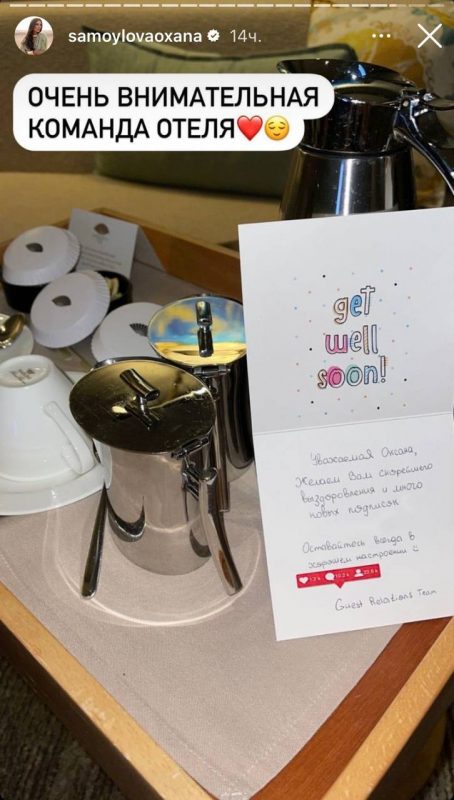 Утром, после завтрака, Самойлова поделилась приятной запиской от команды отеля. Судя по всему, они знали о недомогании девушки и оставили ей открытку с пожеланием скорейшего выздоровления: «Уважаемая Оксана, желаем вам скорейшего выздоровления и много новых подписок в личном блоге. Оставайтесь всегда в хорошем настроении».