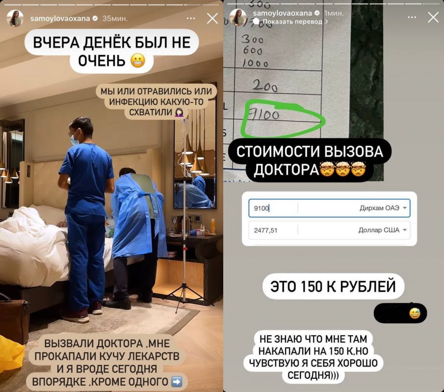 «Вчера денек был не очень – мы или отравились, или инфекцию какую-то схватили. Вызвали доктора, мне прокапали кучу лекарств, и я вроде сегодня в порядке, кроме одного - стоимости вызова доктора. Не знаю, что мне там накапали на 150к, но чувствую я себя хорошо сегодня», - призналась модель, прикрепив фотографию выставленного счета на общую сумму 9 100 дирхам (по нынешнему курсу около 150 тысяч рублей – прим.ред.).