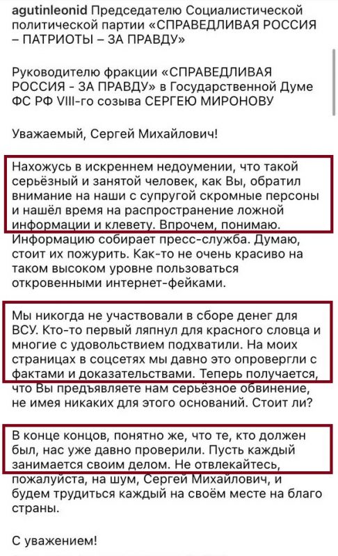 Отдельно Леонид обратился к председателю политической партии «Справедливая Россия» Сергею Миронову, который не смог пройти мимо слухов и призвал запретить Агутину участвовать в музыкальном фестивале «Stereoleto». Певец добавил, что политик располагает недостоверной информацией.