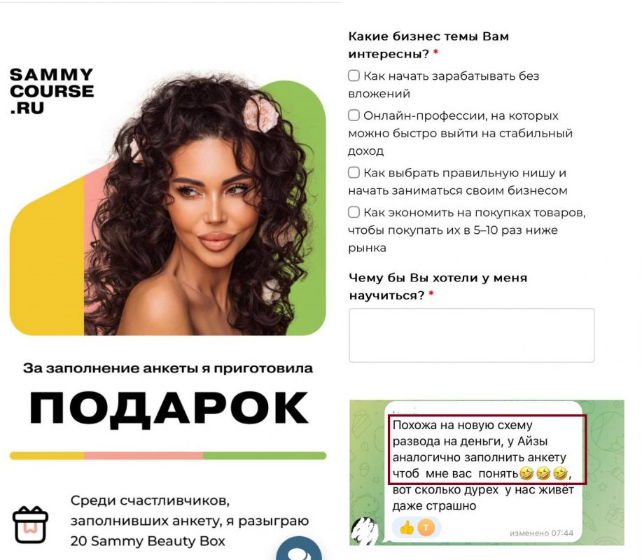Это подтверждает и название сайта, на котором размещен опрос – SammyCourse (СаммиКурс – пер. с англ.). Кроме того, после анкеты подписчиков «отправляют» в новый Telegram-канал, в котором девушка обещает «освещать свое видение ондайн-рынка», а также делиться своим опытом построения бизнеса.