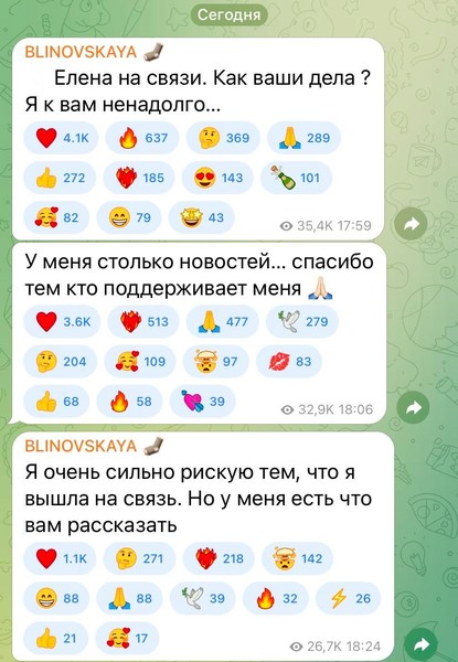 «На связи. Как ваши дела? Я к вам ненадолго… У меня столько новостей. Спасибо тем, кто поддерживает меня. Я очень сильно рискую, что вышла на связь. Но у меня есть что вам рассказать», - гласит запись на странице Блиновской.