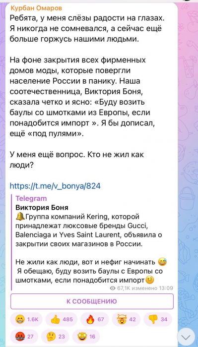 «Ребята, у меня аж слезы радости на глазах! Я никогда не сомневался, а сейчас еще больше горжусь нашими людьми. На фоне закрытия всех фирменных домов моды, наша соотечественница, Виктория Боня, сказала четко и ясно: «Буду возить баулы из Европы со шмотками, если понадобится импорт». Я бы дописал еще «под пулями», - с иронией ответил Курбан теледиве.