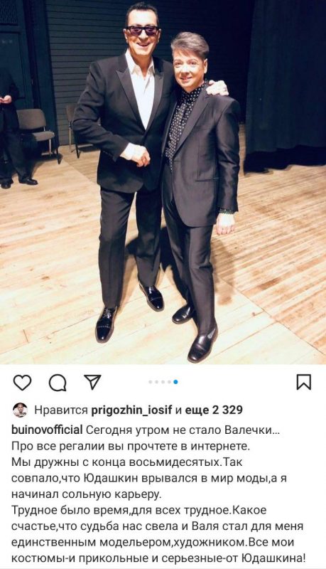Певец и композитор Игорь Николаев рассказал, что он был первым артистом, для которого Валентин создал концертный костюм: «И все эти годы нас согревал твой талант, твоя доброта, щедрость души, мягкосердечие и любовь! Мои глубокие соболезнования Мариночке, Галочке и всей большой семье Юдашкиных».