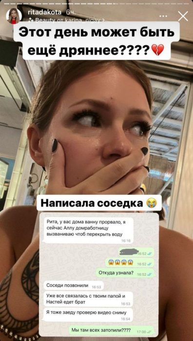 Пока певица и блогер Рита Дакота отдыхает вместе со своим возлюбленным и дочерью на Бали, в ее квартире в Москве случился потоп. Об этом девушка сама рассказала в своём Instagram. Рита Дакота не смогла скрыть эмоции: «Я беспомощное унылое чмо», - сказала певица в stories. Также певица не смогла сдержать слез.