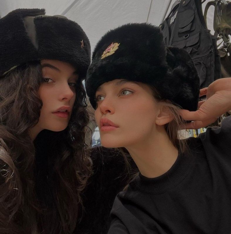 Подруга модели Эмили Бруни опубликовала в личном блоге фото Девы - на них она позирует в армейской шапке-ушанке с эмблемой СССР. Эмили передала слова девушки: «Не переживай, папа! Я с русскими».