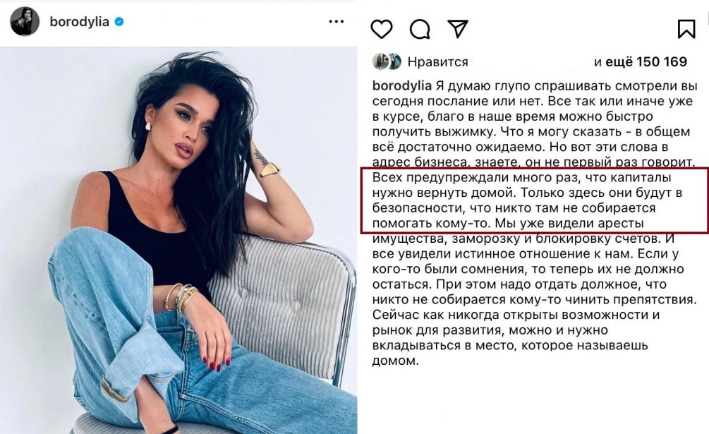 «Эти слова в адрес бизнеса, знаете, не первый раз говорят. Всех предупреждали много раз, что капиталы нужно вернуть домой - только здесь они будут в безопасности. Мы уже видели аресты имущества, заморозку и блокировку счетов. Если у кого-то были сомнения, то теперь их не должно остаться», - написала брюнетка.