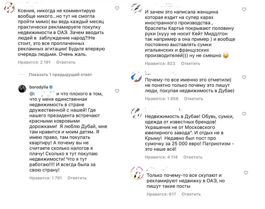 «Ксения, никогда не комментирую вообще никого, но тут не смогла пройти мимо… Вы ведь каждый месяц практически рекламируете покупку недвижимости в ОАЭ. Зачем вводить в заблуждение народ?!», «Недвижимость в Дубае. Обувь, сумки и одежда от известных брендов. Украшения не от «Московского ювелирного завода» и отдых не в Крыму. Патриотизм – это наше все», «Только почему-то все скупают и рекламируют недвижку в ОАЭ, но пишут такие посты», «И зачем это написала женщина, которая ездит на суперкарах иностранного производства, браслеты Картье покрывают половину ее руки, а сумки итальянских и французских производителей выставляются напоказ. Ну не смешно?», - возмутились пользователи Сети.